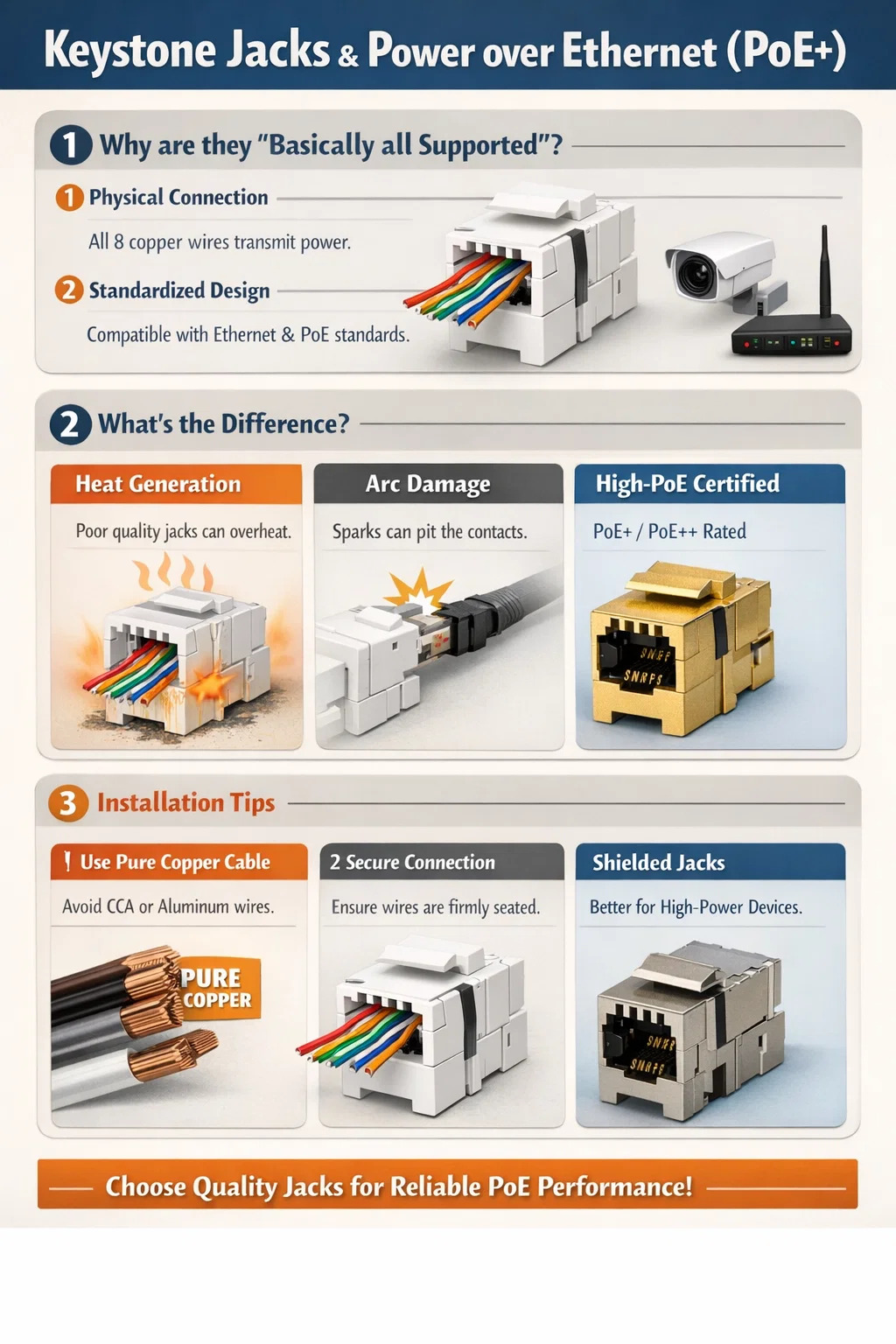 Marea majoritate a conectorilor standard de cablu de rețea ( Keystone Jacks ) acceptă fizic Power over Ethernet (PoE), dar nu toate produsele sunt la fel de fiabile în condiții de funcționare reală la sarcină mare.