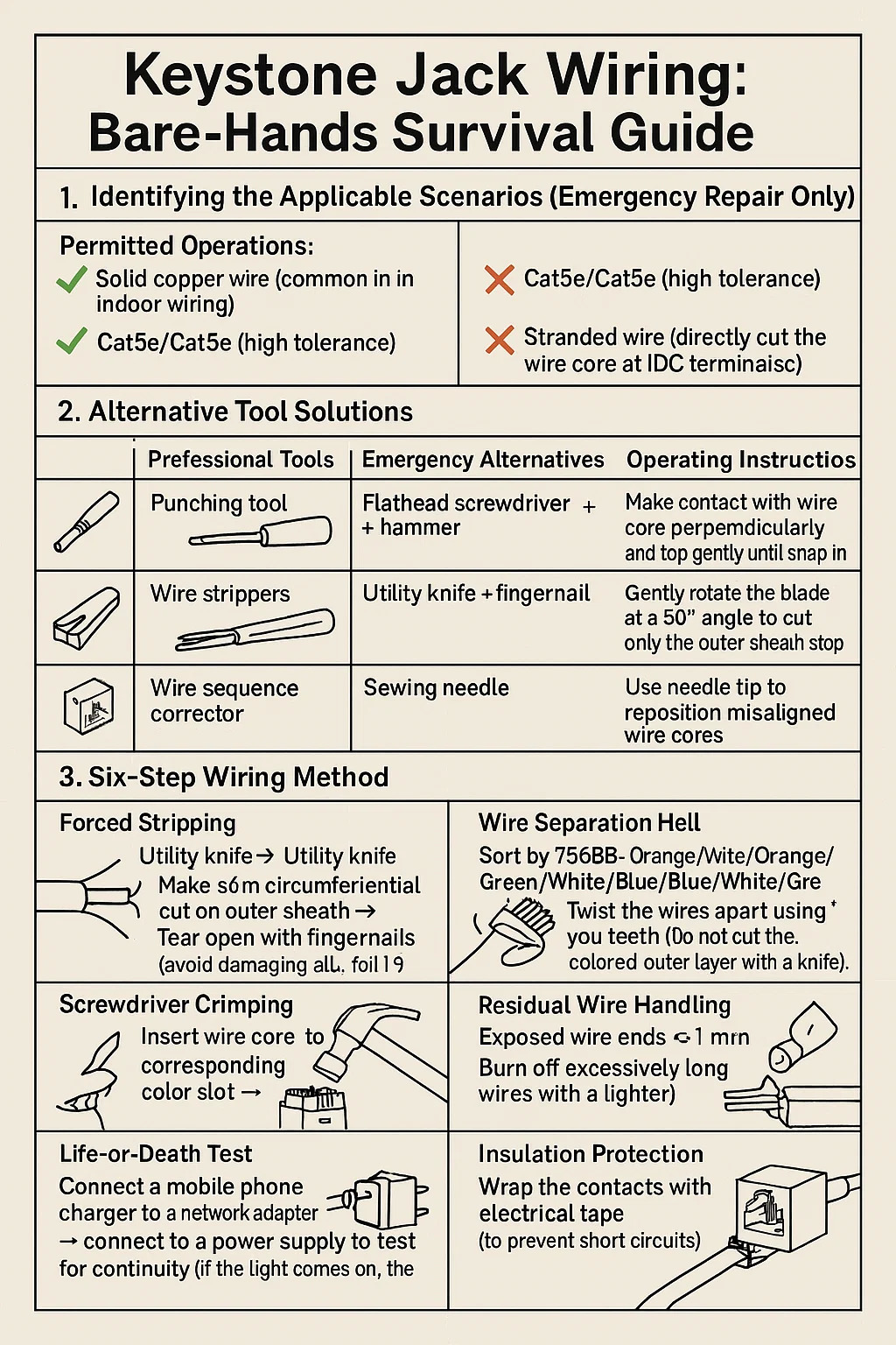 • Sertizarea șurubelniței: Introduceți miezul sârmei în fanta de culoare corespunzătoare → Apăsați vârful șurubelniței pe placa metalică → Loviți ușor cu un ciocan o dată (mai multe bătăi vor distruge firul).