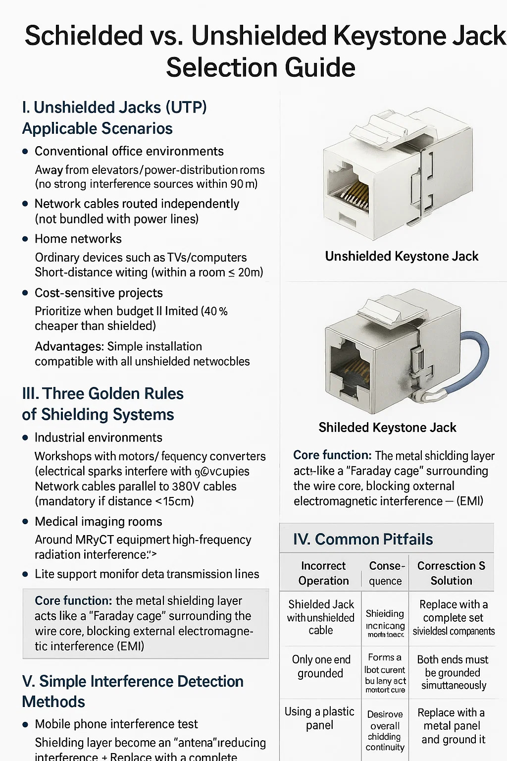| Folosind mufe ecranate cu cablu UTP | Scutul acționează ca o antenă, atrăgând interferențe | Înlocuiți întreaga rulare cu componente ecranate cu cablu STP/FTP |