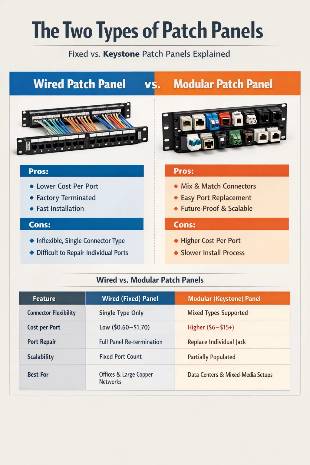 Un panou de corecție cu fir vine cu cabluri deja terminate în spatele panoului din fabrică. Un panou de corecție modular, pe de altă parte, este livrat ca un cadru gol care acceptă mufe keystone interschimbabile, permițând instalatorului să aleagă tipuri de conectori, categorii și chiar să amestece tipuri de media într-un singur panou. Ambele îndeplinesc aceeași funcție de bază - organizarea și rutarea conexiunilor de rețea - dar fac acest lucru în moduri fundamental diferite și se potrivesc diferitelor scenarii de implementare.