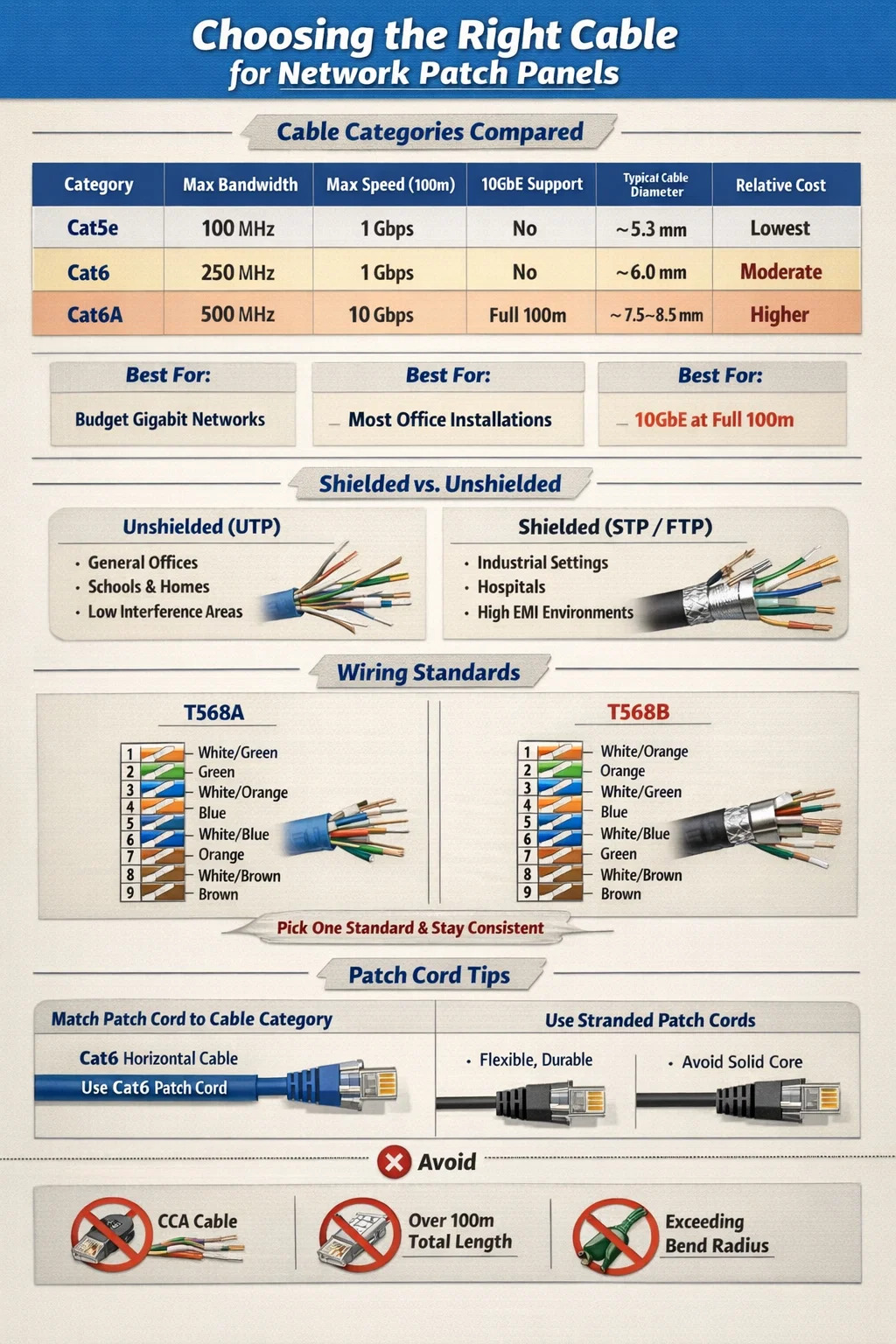 Deoarece un panou de corecție introduce puncte de conectare suplimentare - terminații punch-down în spate și porturi RJ45 în față - este esențială utilizarea unei categorii de cablu care se potrivește sau depășește categoria nominală a panoului dvs. Amestecarea unui panou de corecție Cat6A cu rulări orizontale Cat5e, de exemplu, limitează imediat sistemul dumneavoastră la performanța Cat5e, indiferent de ceea ce este evaluat panoul în sine.